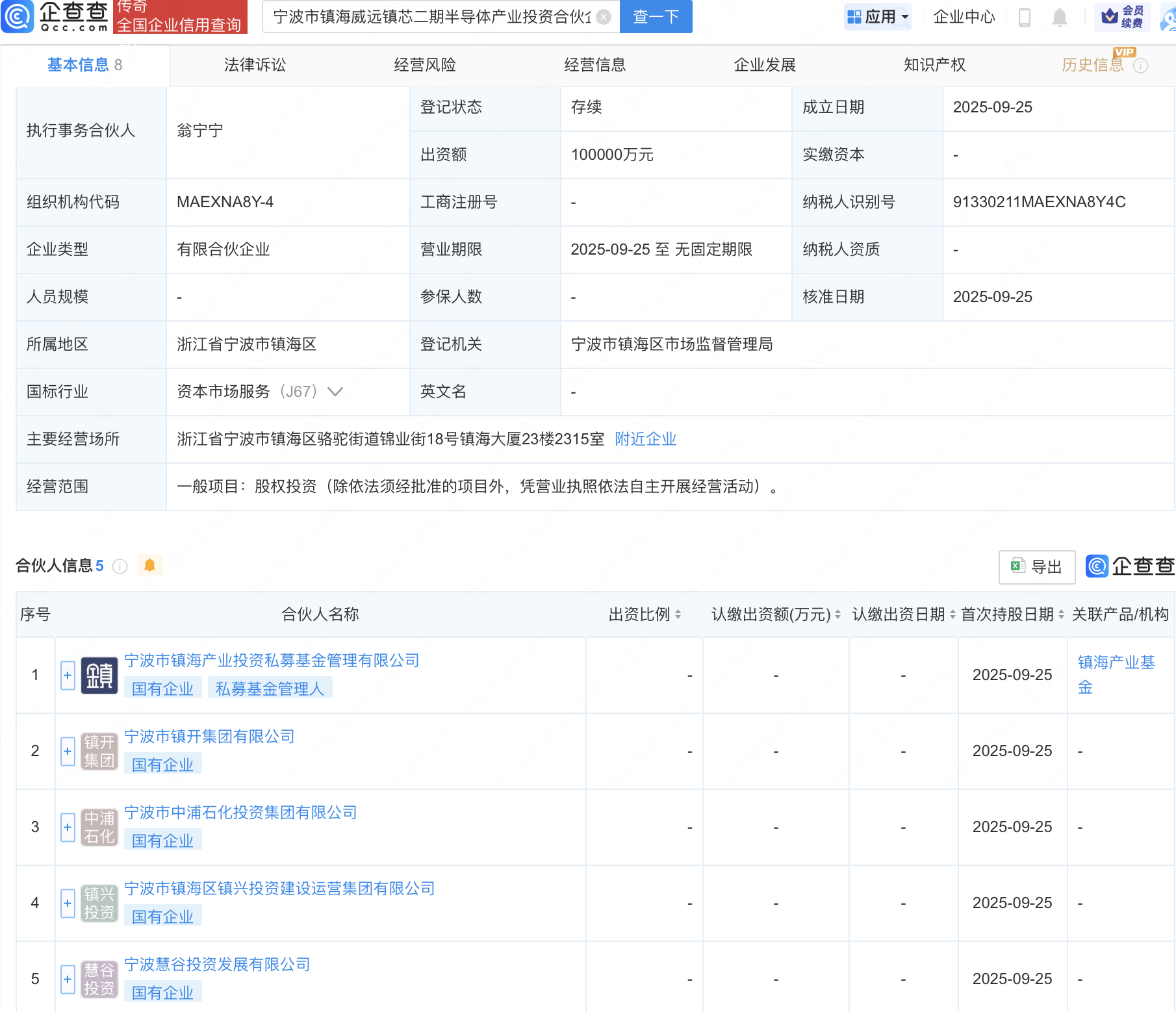 近日,宁波市镇海威远镇芯二期半导体产业投资合伙企业(有限合伙)成立,出资额10亿元实盘股票配资申请,经营范围包含:股权投资。企查查股权穿透显示,该企业由宁波市镇海产业投资私募基金管理有限公司等共同出资。