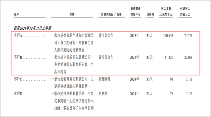 首先就是瑞博生物存在的过度依赖合作方的风险。目前瑞博生物主要与齐鲁制药和勃林格殷格翰进行BD模式合作,在2024年的营收中,勃林格殷格翰贡献超过70%,合作客户数量过少将严重削弱收入的稳定性,如果大客户因为战略调整或者临床试验失败而终止合作,公司将面临收入的断崖式下滑。