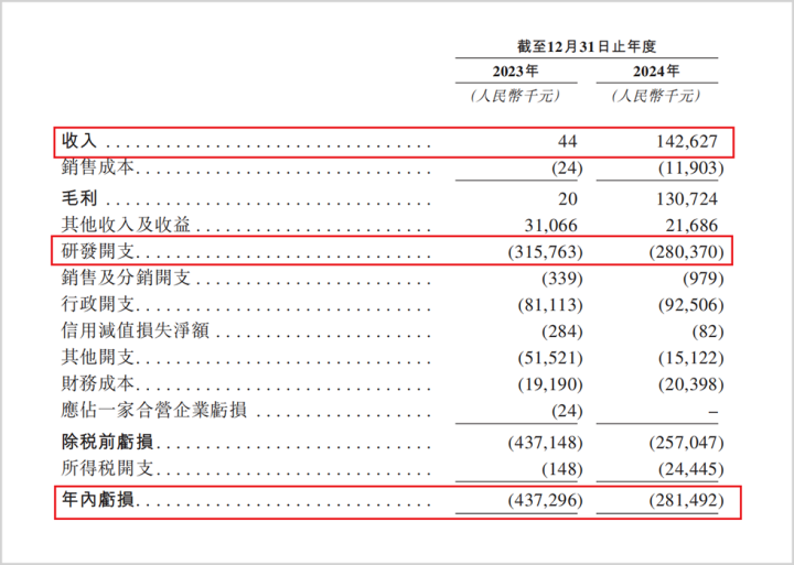 招股书显示,2023至2024年(简称报告期),公司的营收分别为4.4万元和1.43亿元。而对应的净亏损分别为4.37亿元和2.81亿元,两年合计亏损7.18亿元。从成立至今,累计亏损更是达到了15.22亿元。
