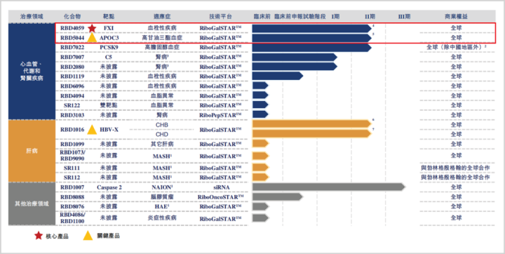 弗若斯特沙利文的数据显示,瑞博生物的核心产品RBD4059即靶向FXI的siRNA是全球首款、也是临床开发进展最快的用于治疗血栓性疾病的siRNA药物。此外其正在推进的RBD5044是全球第二个进入临床开发的靶向APOC3的siRNA。